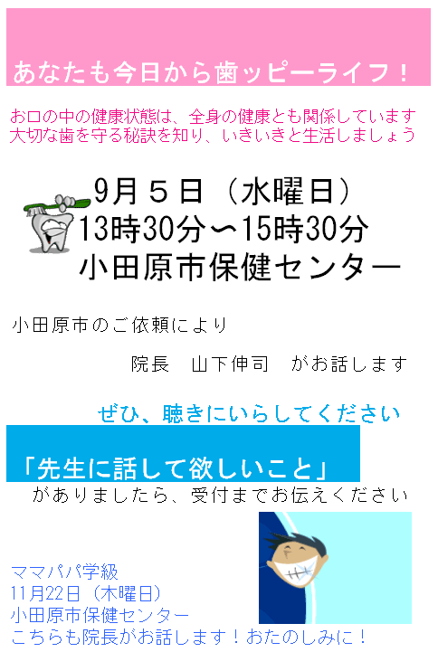 JCに入ってよかった、トドクラブに入っていてよかった。 先日、83歳のお誕生日を迎えられた患者さまが、定期健診にお見えになって、「もうすぐ先生のおっしゃっていた90歳、この20年間、先生の言葉を目標にしてきたんですよ、どうでしょうね?」と、にこにことお話しくださいました。 地域社会に貢献し、世の中のリーダーであるJCメンバーのみなさま、ぜひ、私といっしょにスマイルエイジングしましょう! 一寸木君、理事長おめでとうございます 6月16日(木)午後1:30?3:00、小田原市保健センターにおきまして『歯の調子、いかがですか?』をテーマに、私 山下伸司が、お話しさせていただきます。ふるってご参加をお願いいたします 2005年5月25日 |